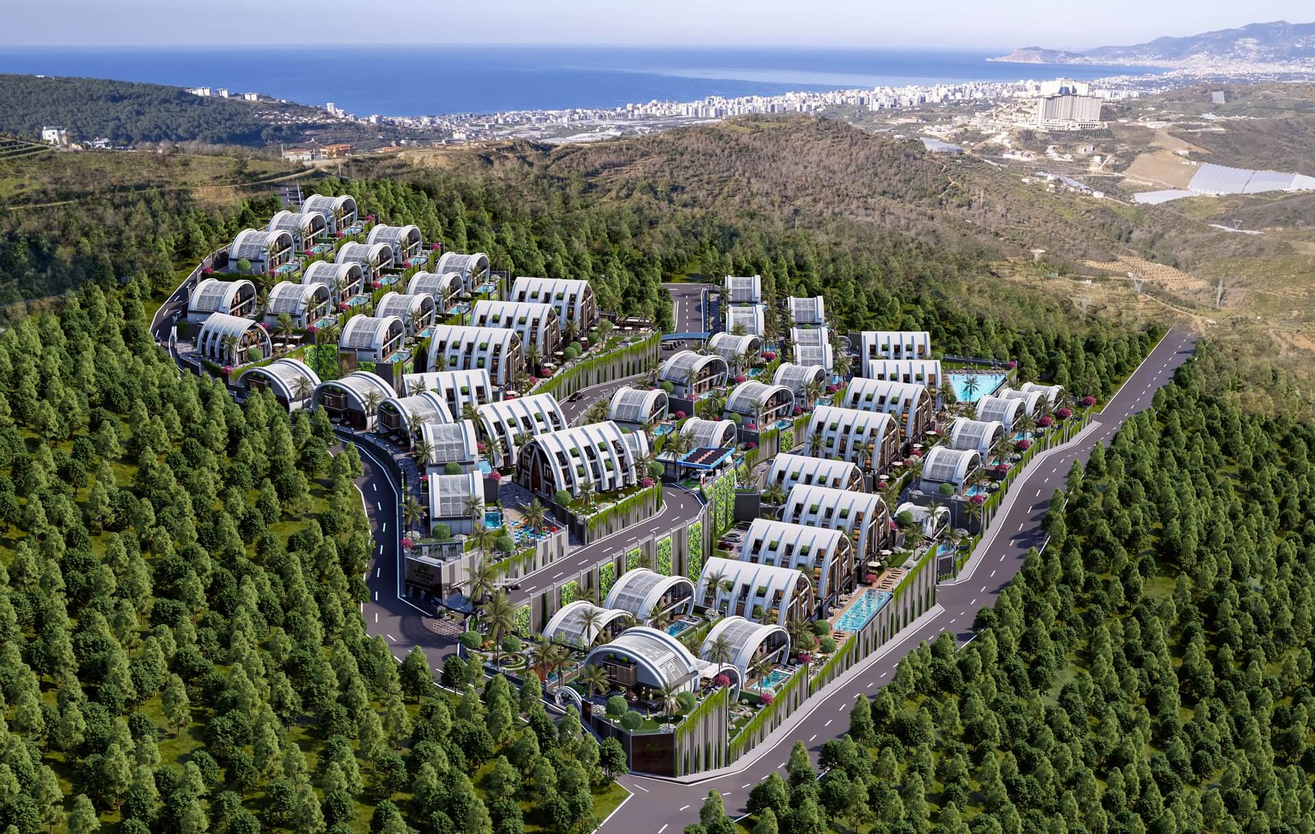 Комплекс расположен в живописной местности с удобным доступом к ключевым объектам инфраструктуры: до пляжа всего 4 км, до аэропорта Газипаша – 20 км, а медицинский центр находится на расстоянии 3,5 км.